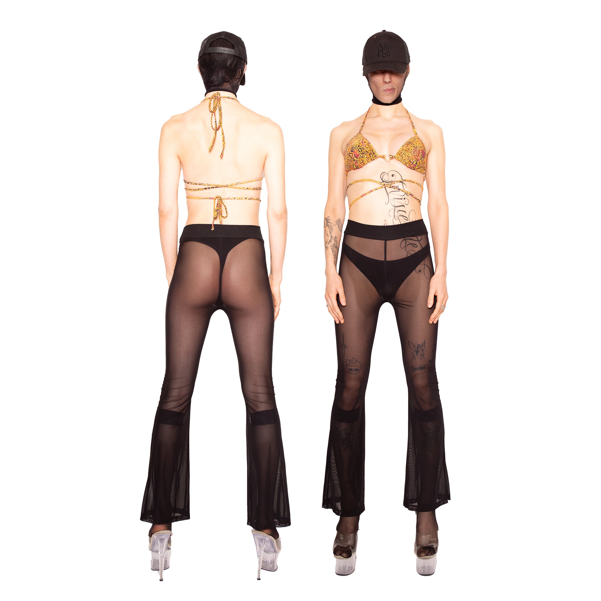 These sheer flare pants add a dramatic touch to your look with their flowing fabric and high-waisted design, creating a striking silhouette. Versatile and timeless, they pair effortlessly with a bikini top, an oversized t-shirt, a shirt, or a fitted crop, making them an essential piece that goes with everything.