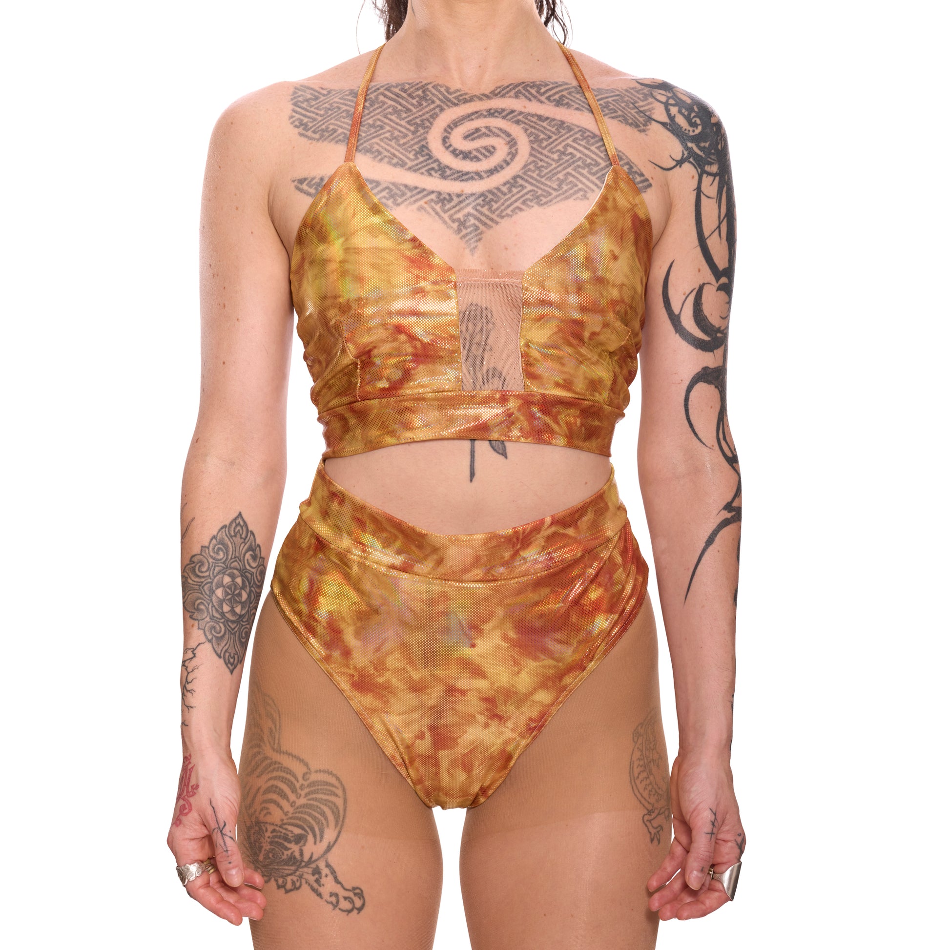 These versatile briefs come in both high- and mid-waisted designs and are available in various colors, including metallic and black finishes. The shimmering fabric adds a touch of glamour, while the high-cut design ensures a bold yet comfortable fit. Perfect for pairing with crop tops, sheer overlays, or as a sleek layer under dresses, these briefs are a staple for any wardrobe. A basic piece for all Vitali lovers, these briefs are essential for creating confident, stylish looks for any occasion.